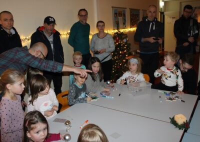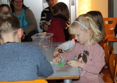 Nachdem wir gemeinsam in den Treppenhäusern Weihnachtslieder gesungen haben, begann unser Striezelmarkt offiziell. Die Kinder konnten ihre eigenen Weihnachtstütchen gestalten, um all die liebevoll hergestellten Basteleien – Weihnachtsgestecke, Kugeln und Baumschmuck, Kekshäuser, Anhänger und vieles mehr – sicher mit nach Hause zu nehmen.